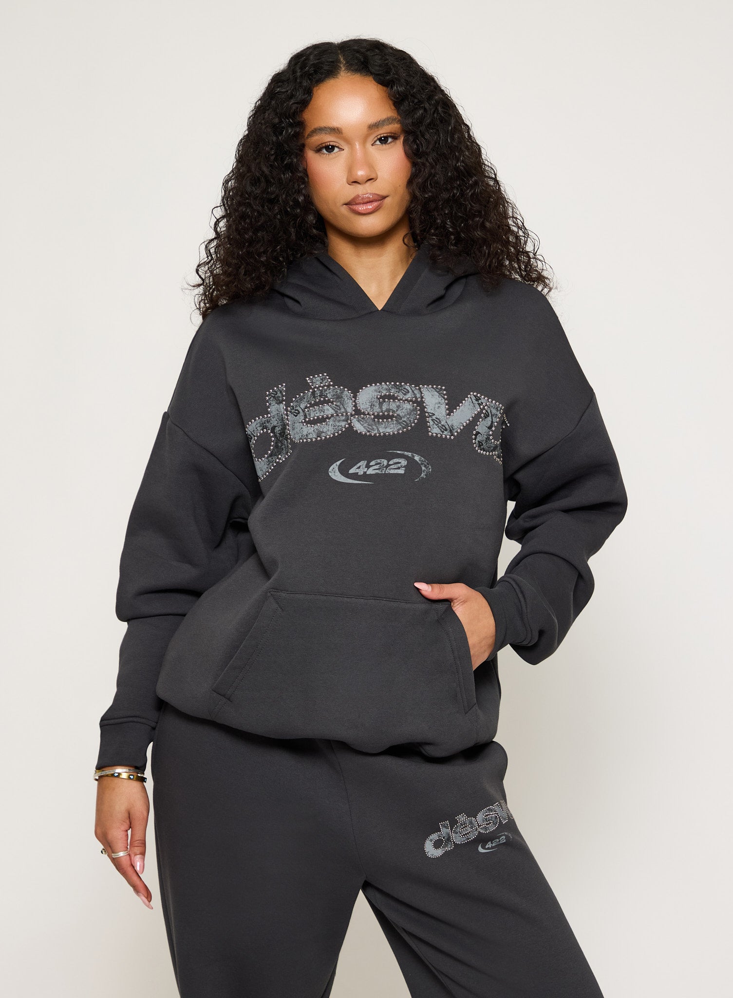 The 422 Asphalt Hoodie is cut from heavyweight fleece with a soft brushed interior and an oversized, relaxed fit. Finished with a studded dés vu 422 logo across the chest - just the right amount of flash against the deep charcoal base. Ribbed cuffs, dropped shoulders, and a kangaroo pocket keep it classic while the details do the talking.