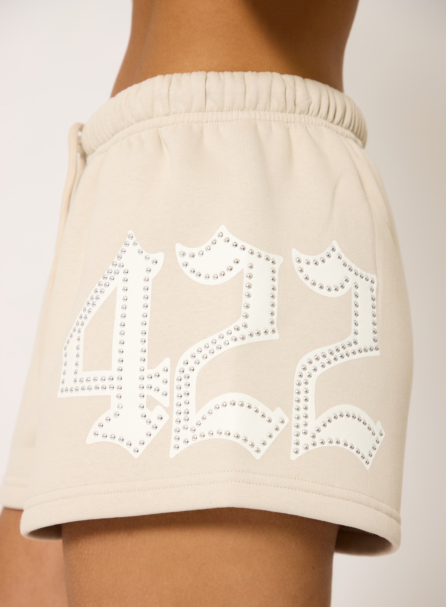 Soft, low-rise shorts with a bold, studded 422 — angel energy, always working in your favour.