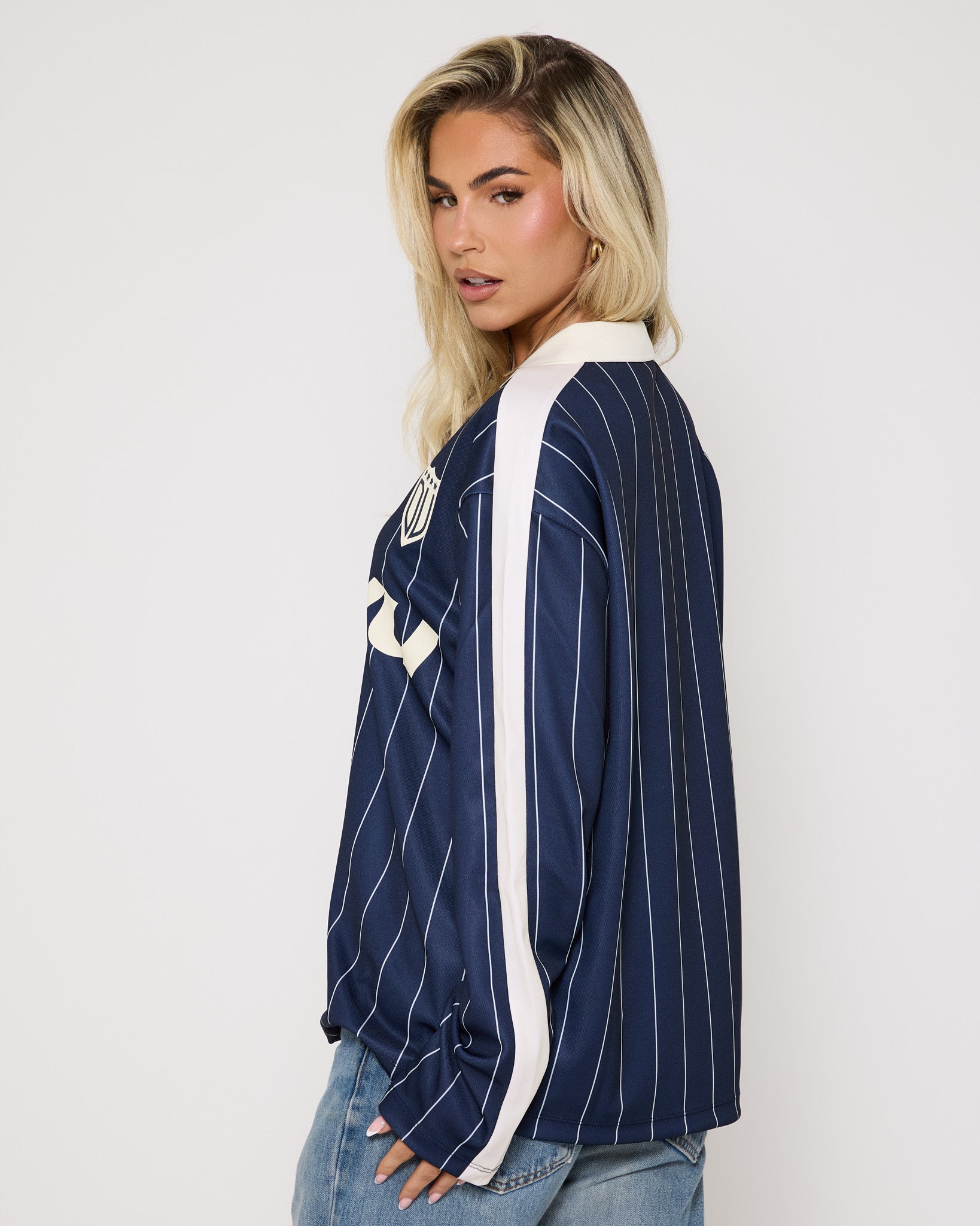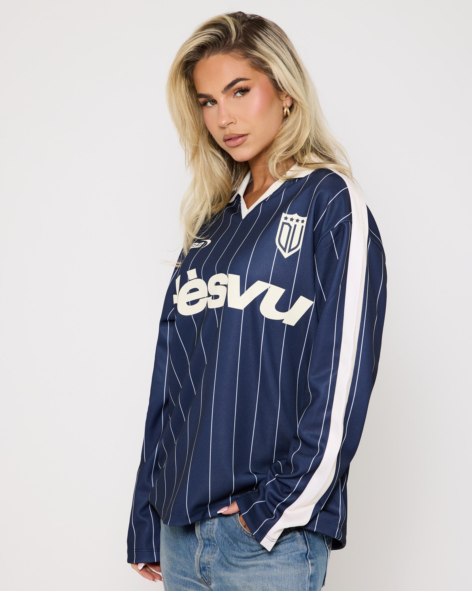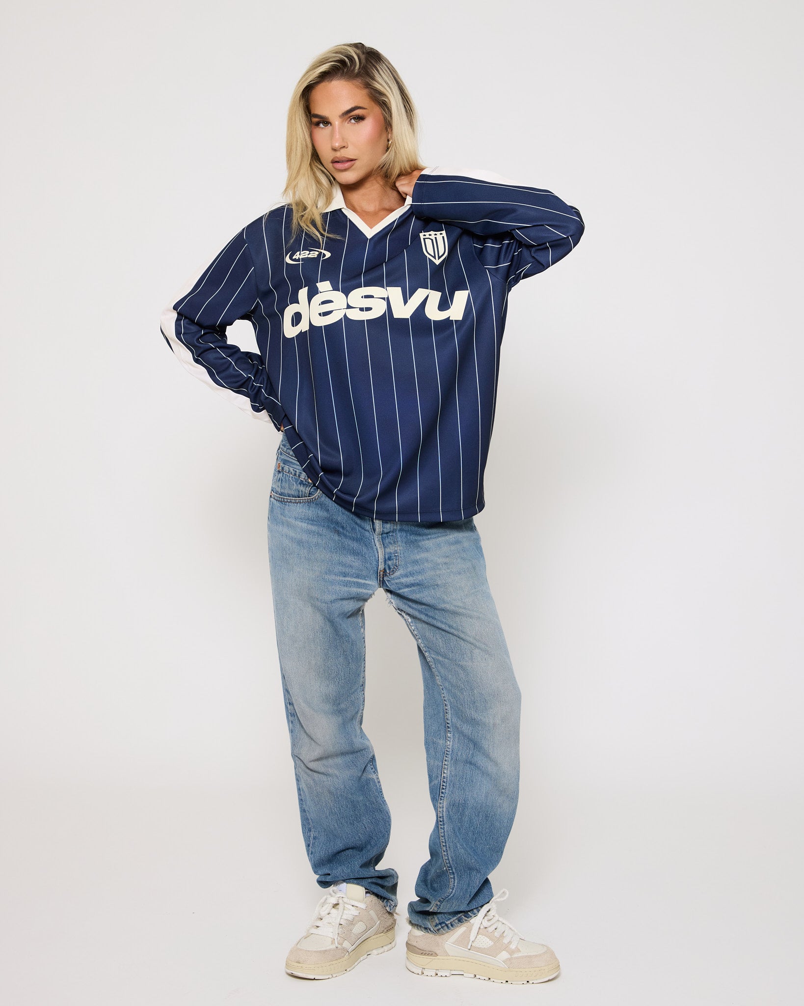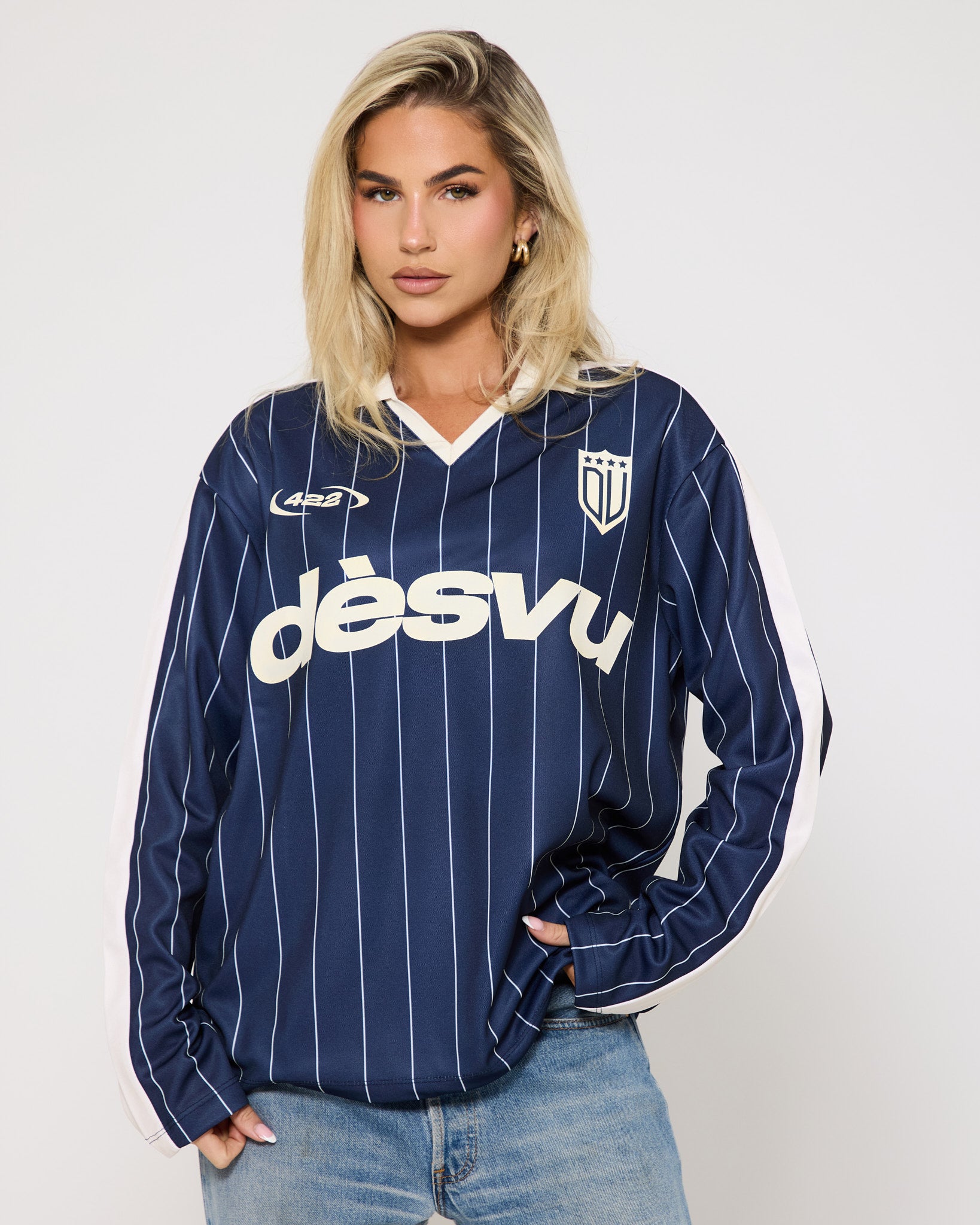 The 422 Football Long Sleeve takes classic pitch style and gives it the dès vu treatment. a relaxed, oversized fit with contrast pinstripes and bold logo detailing across the chest. designed in deep navy with white sleeve panels and embroidered crest and 422 accents for a clean, athletic finish.