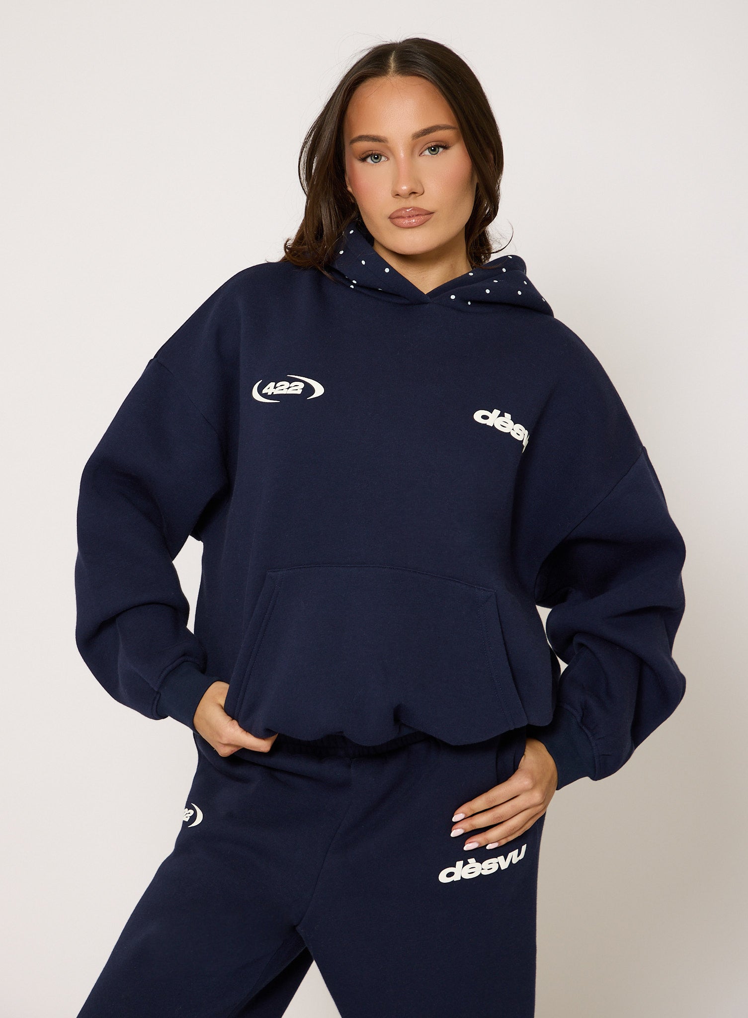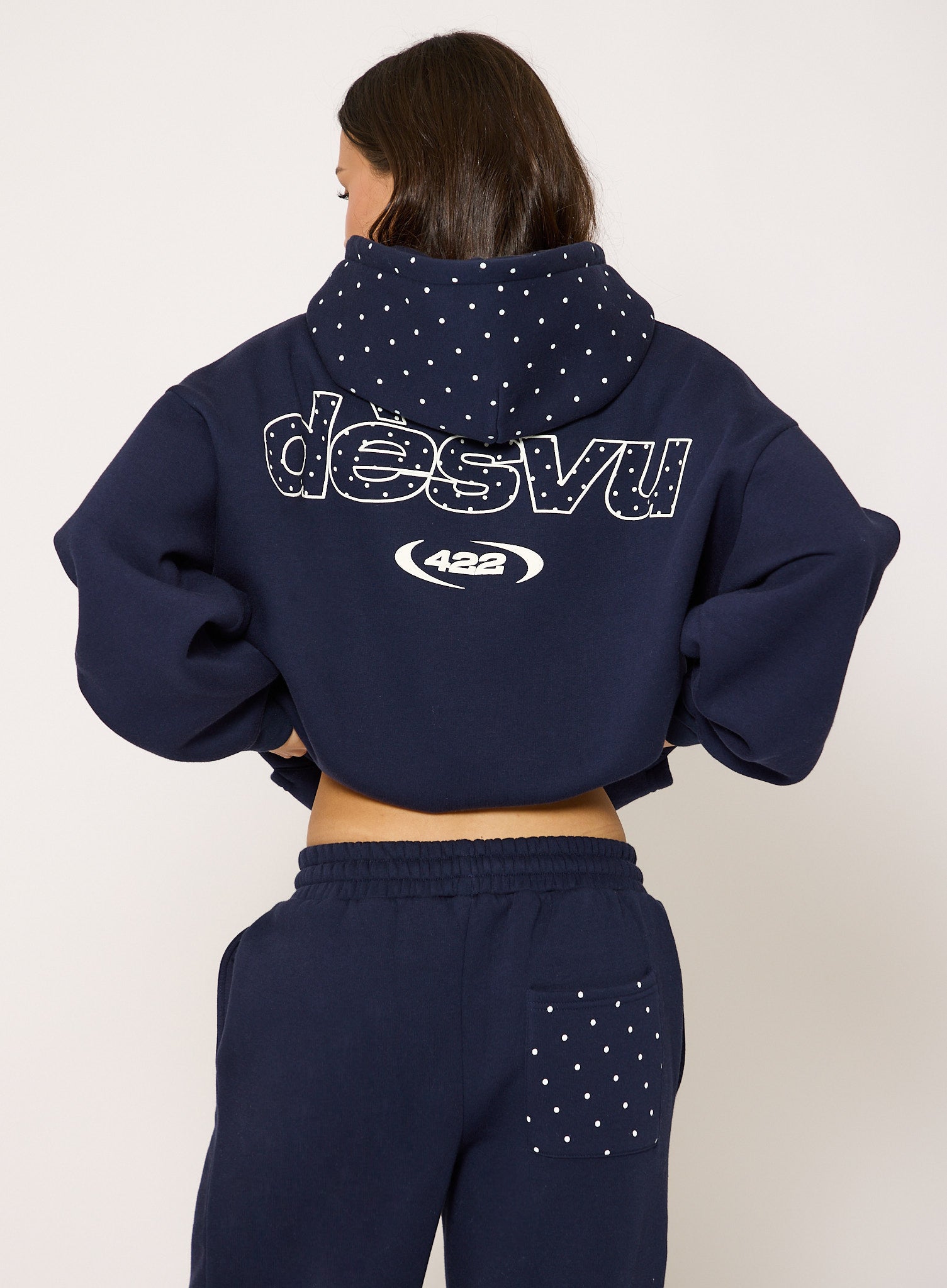 An oversized hoodie featuring the signature DÈS VU graphic across the back and 422 logo on the front. Finished with a polka dot print hood, a subtle detail that makes the whole look hit harder.